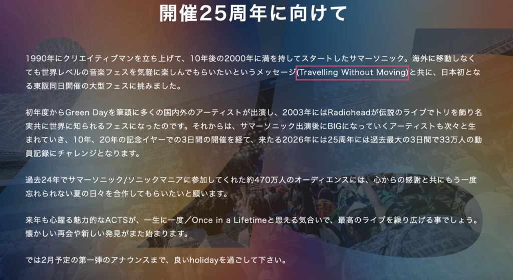 来年開催されるSUMMERSONICは25周年とのことで期待値が上がっているのではないでしょうか。