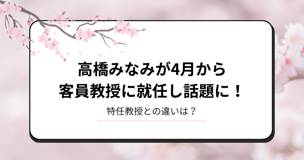元AKB48のメンバーである高橋みなみさんが4月から洗足学園音楽大の客員教授に就任したことが発表されました! 芸能人を客員教授に迎えるケースはなかなか珍しい事例で、世間でも注目を集めています。 そこで本記事では、客員教授についてや特任教授との違... -